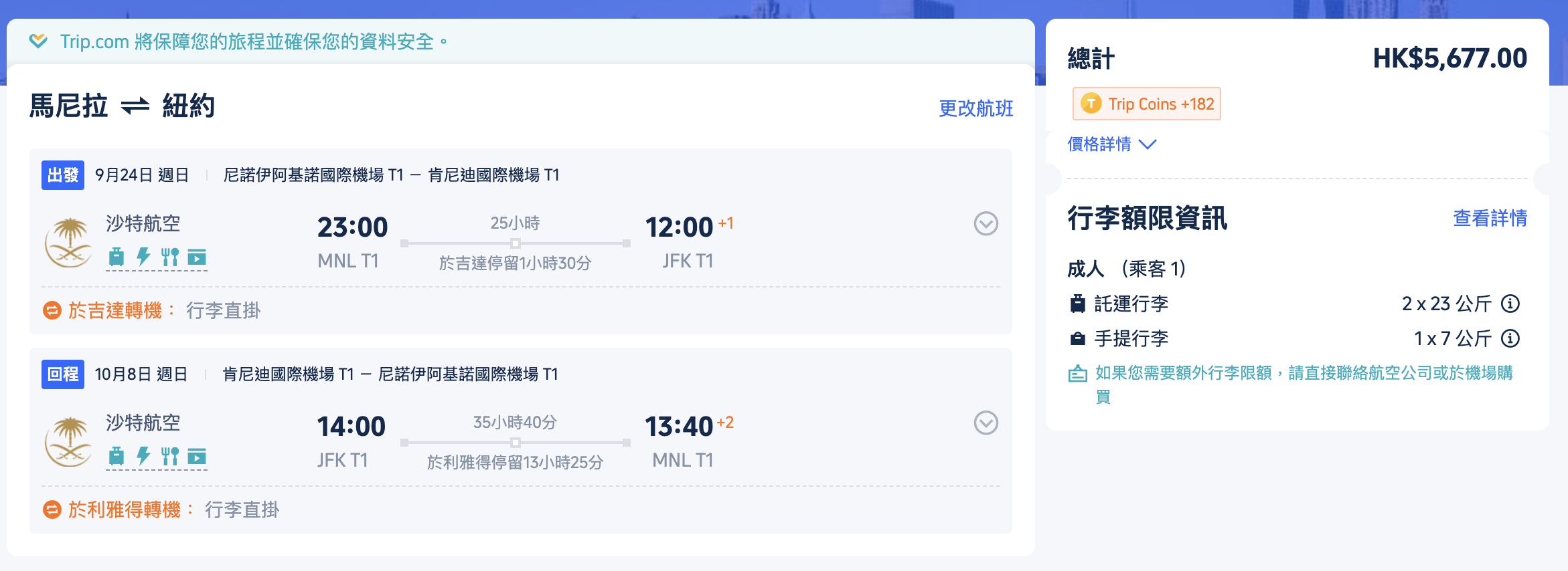 【紐約】轉做馬尼拉出發!即刻5千7搞掂!沙特阿拉伯航空來回紐約連稅$5,718起!包2件23kg行李,2023年9月出發!