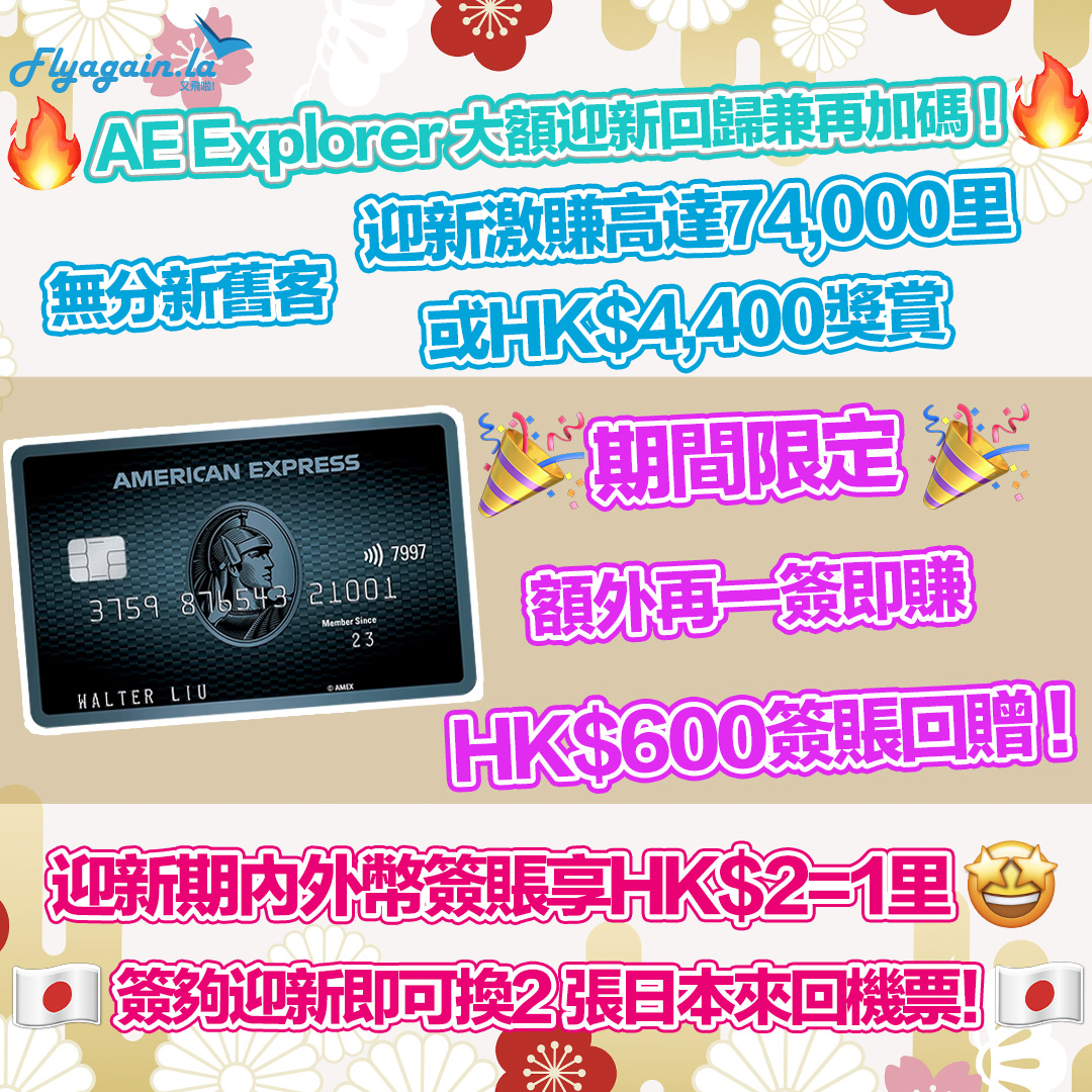 旅行神卡2026全新迎新優惠!AE Explorer卡迎新獎賞高達71,000里+HK$500簽賬回贈 可兌換2套來回日本機票 環亞機場貴賓室禮遇!