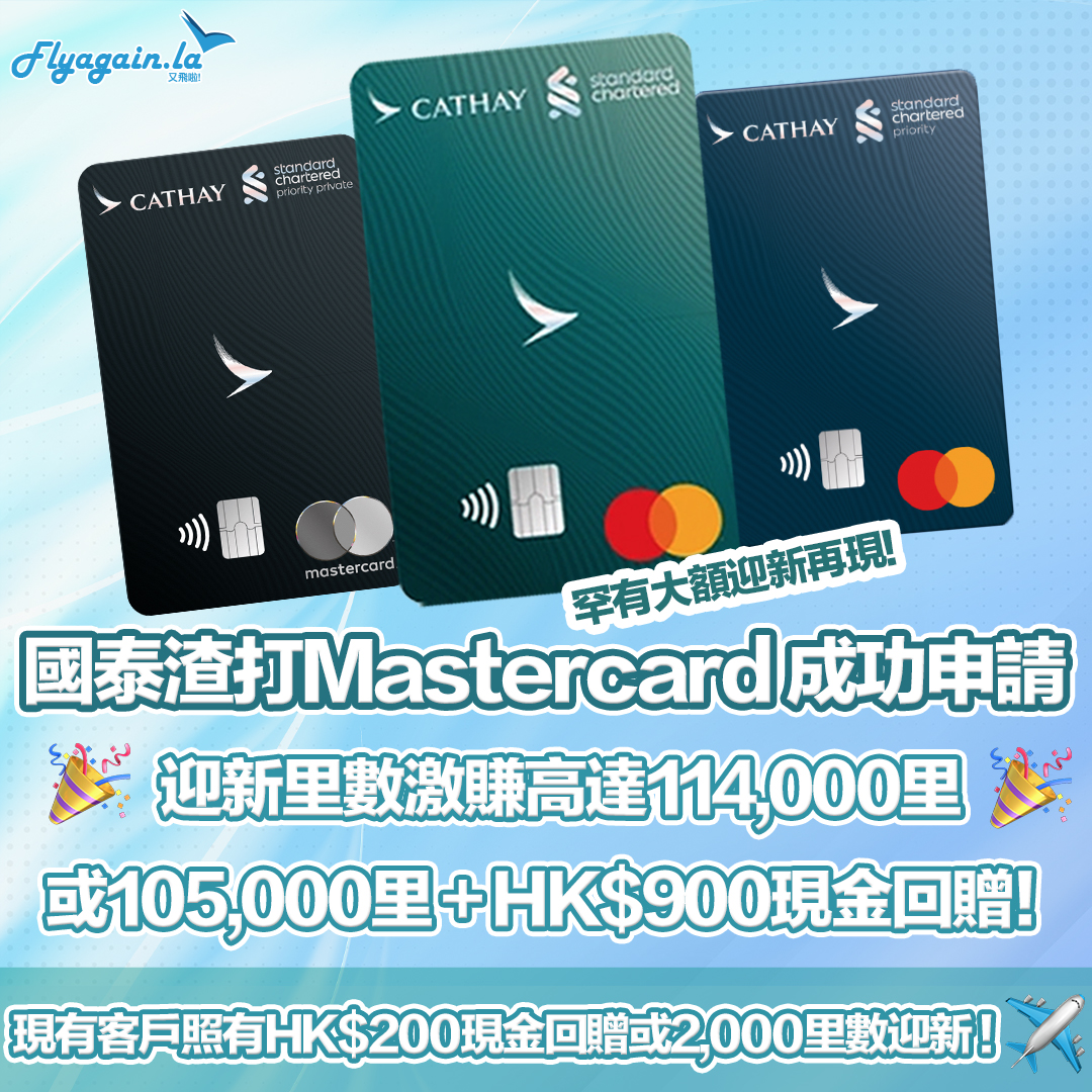 儲里數神卡!渣打國泰Mastercard 食肆/外賣平台、網上及海外簽賬高達HK$2=1里 迎新賺高達109,000里數或100,000里+Flyagain獨家HK$900現金回贈!✈