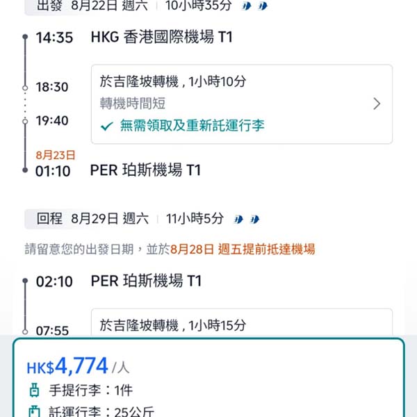 【珀斯】轉機抵玩飛!暑假都有!馬來西亞航空來回珀斯連稅$4,774起!5月至11月指定日子出發