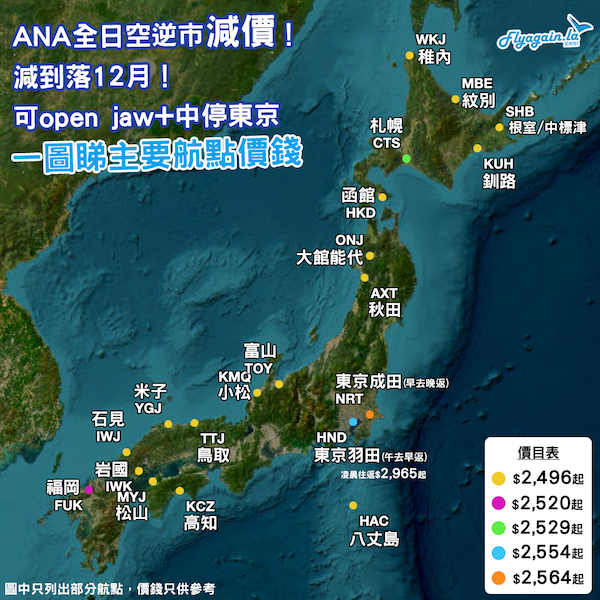 結論:間間都狂加燃油附加費,ANA就反而減價(預計6月起加),平過本地其他航空公司,值得支持!而且好多航點(包括open jaw+中停東京)最平都三千有找,出發期去到 12 月都有,真係好抵玩!如果睇啱,就要快啲入定手plan去日本啦~