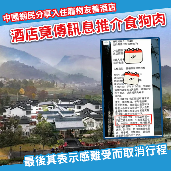 帶自己的狗狗去旅行,酒店竟然推介你吃狗?有中國網民於網上分享指,原計劃前往貴州貴定縣盤江鎮旅遊,並預訂一間標榜「寵物友好」的酒店,打算攜同愛犬入住,惟出發前卻收到酒店訊息,推介當地特色狗肉料理,令他感到不適,最終決定取消行程,並在網上分享經歷提醒其他養寵物人士。