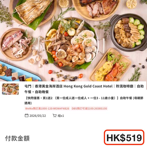 買一送一自助晚餐-成人每位HK$443(一至四)HK$479(五至日、公眾假期)HK$497(5月8至10日)
