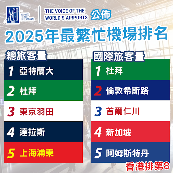 至於國際客運排名方面,杜拜國際機場繼續排名全球第一,而倫敦希斯路機場及仁川國際機場則分別位列第二及第三,反映中東及歐亞樞紐在長途航線中的重要角色仍然穩固。而香港就排第八,上年共處理超過 6,000 萬名旅客(順帶一提,香港的貨運量續居全球第一)。