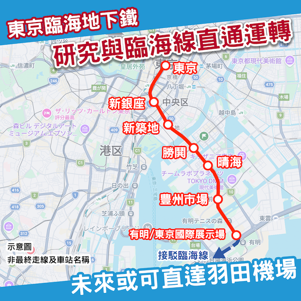 值得留意的是,JR 東日本主導的羽田機場 Access 線本身已計劃於2030年代初提供東京站直達羽田機場的服務,時間上較臨海地下鐵為早。因此,後者未來即使具備直通機場的條件,其角色可能更集中於完善灣岸地區交通網絡。