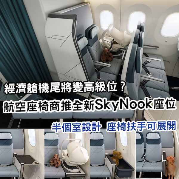 經濟艙未來或再有新變化?美國航空設備公司 Collins Aerospace 近日在德國漢堡舉行的 Aircraft Interiors Expo(AIX)展覽上,公開全新概念經濟艙座位 SkyNook,主打半個室設計,為乘客提供較高私隱度及更多個人空間。