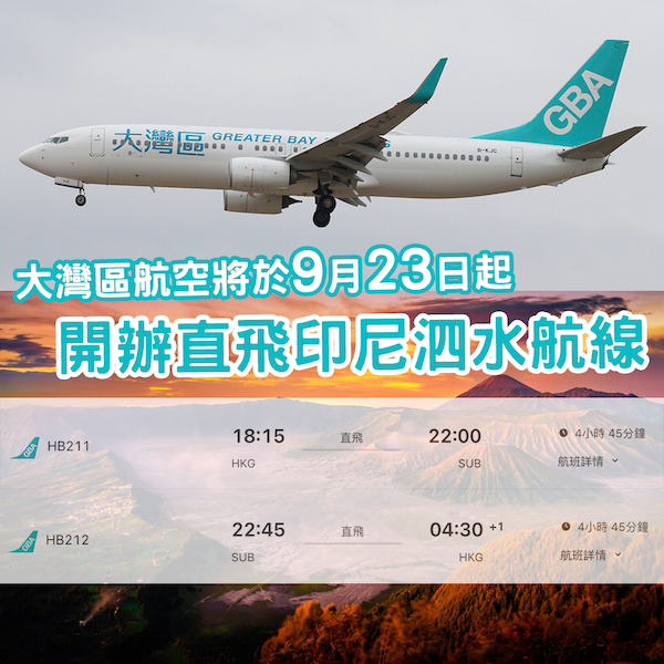 根據大灣區航空官網顯示,其將於 9 月 23 日起開辦「香港-泗水」直航航線,每週 4 班,以波音 73A 執飛,航班時間如下: