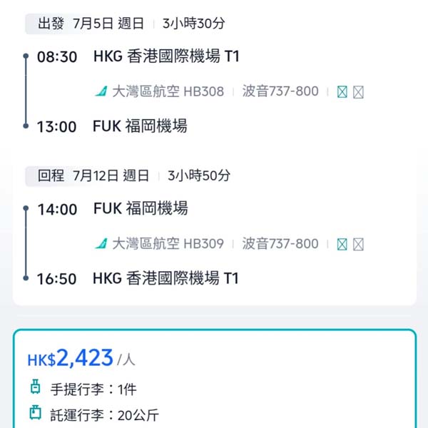 結論:而家直飛福岡真係好貴,連快運唔包行李都要過二千,國泰更近四千,相比下大灣區呢口價包行李真係算幾抵玩!航班早去午返,都算幾唔錯~想飛返轉九州,又唔介意搭大灣區航空,可以考慮下!留意最抵價限以Mastercard付款,唔係就會貴少少~
