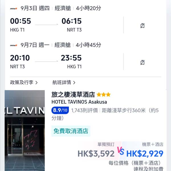 以9月3日出發,9月7日回程(5日4夜)週末遊為例,包來回機票+4晚酒店,每位連稅只係HK$2,929起(兩人一房計):